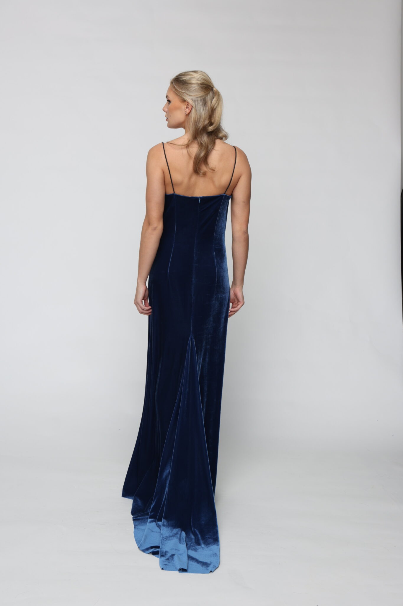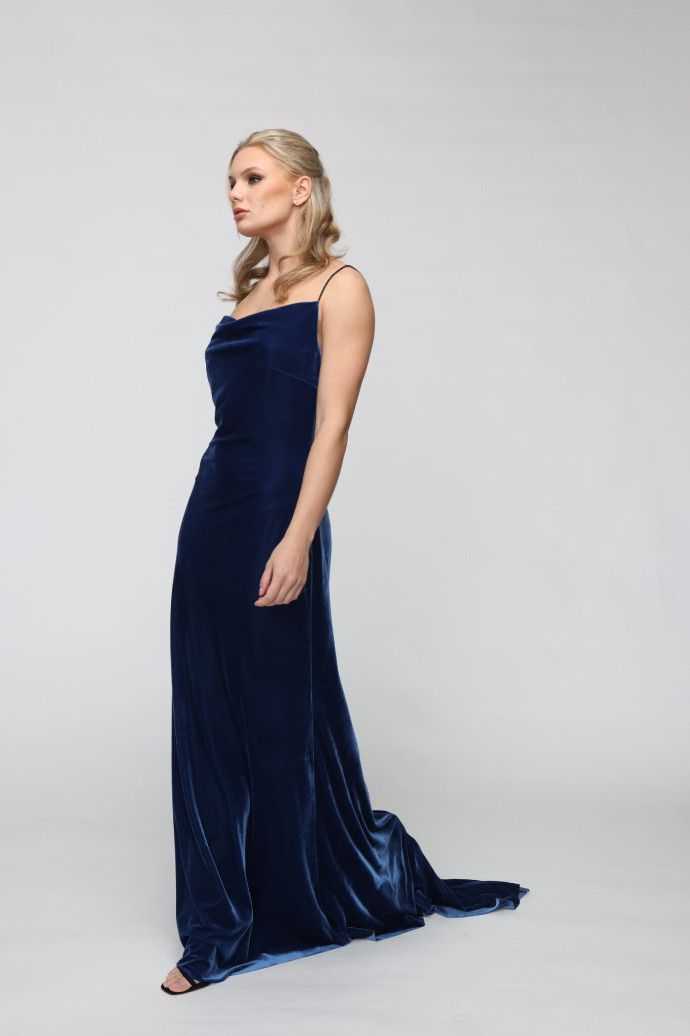 Classic midnight blue velvet gown with thin straps and a draped silhouette (S/M)