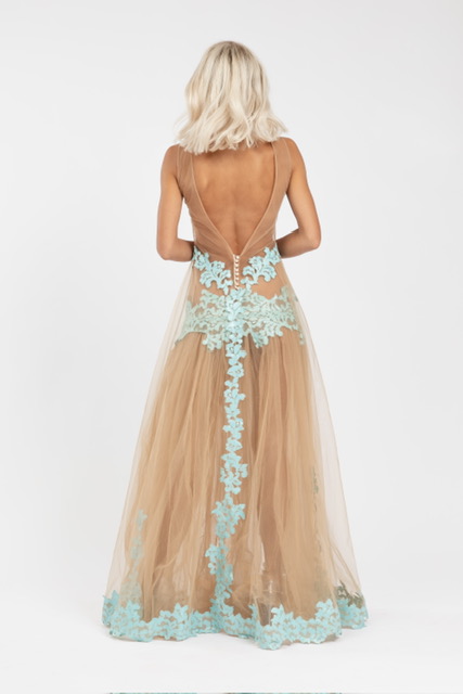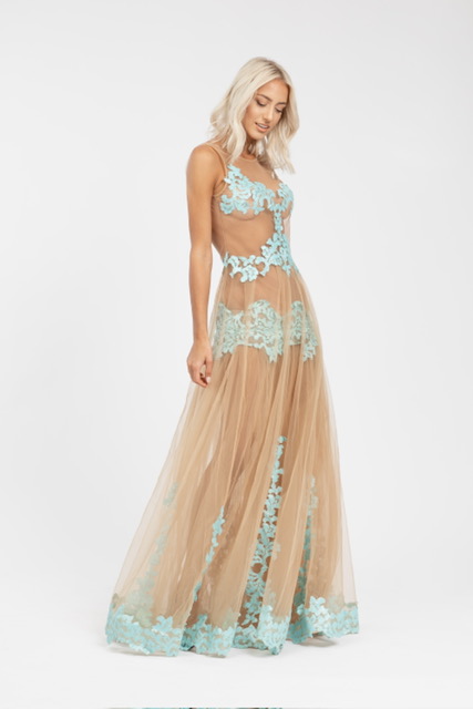 Light nude tulle gown with handcrafted blue detailing (S/M)